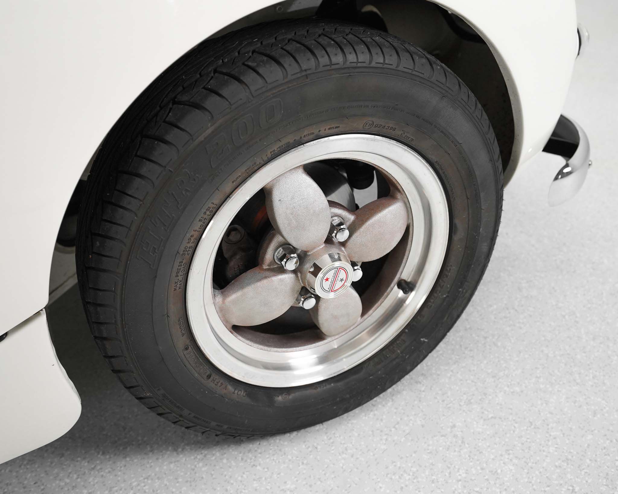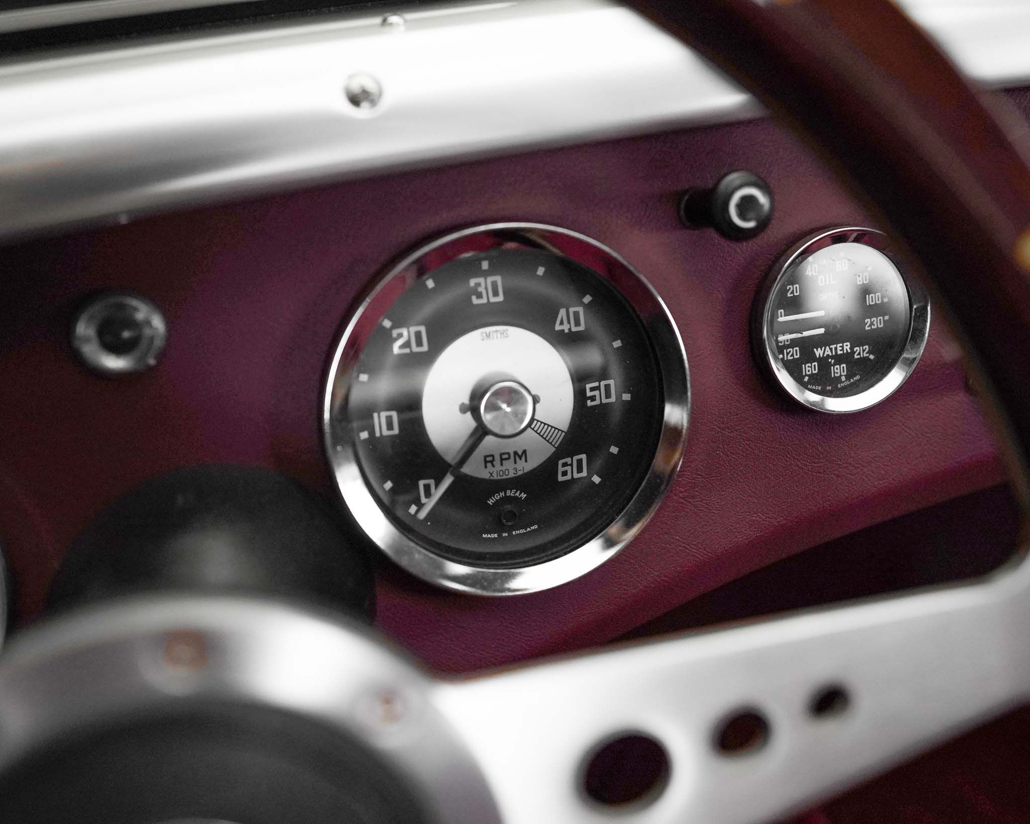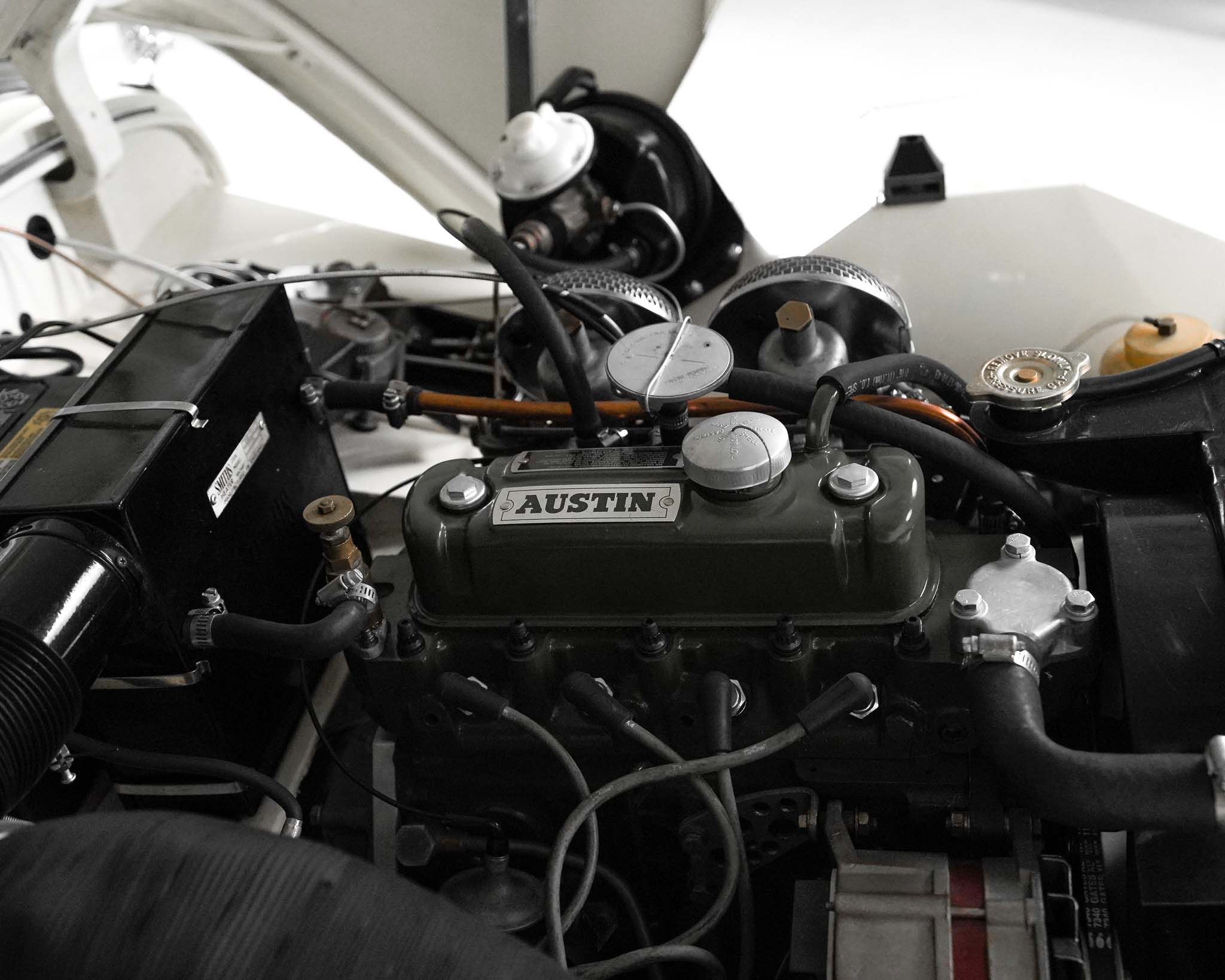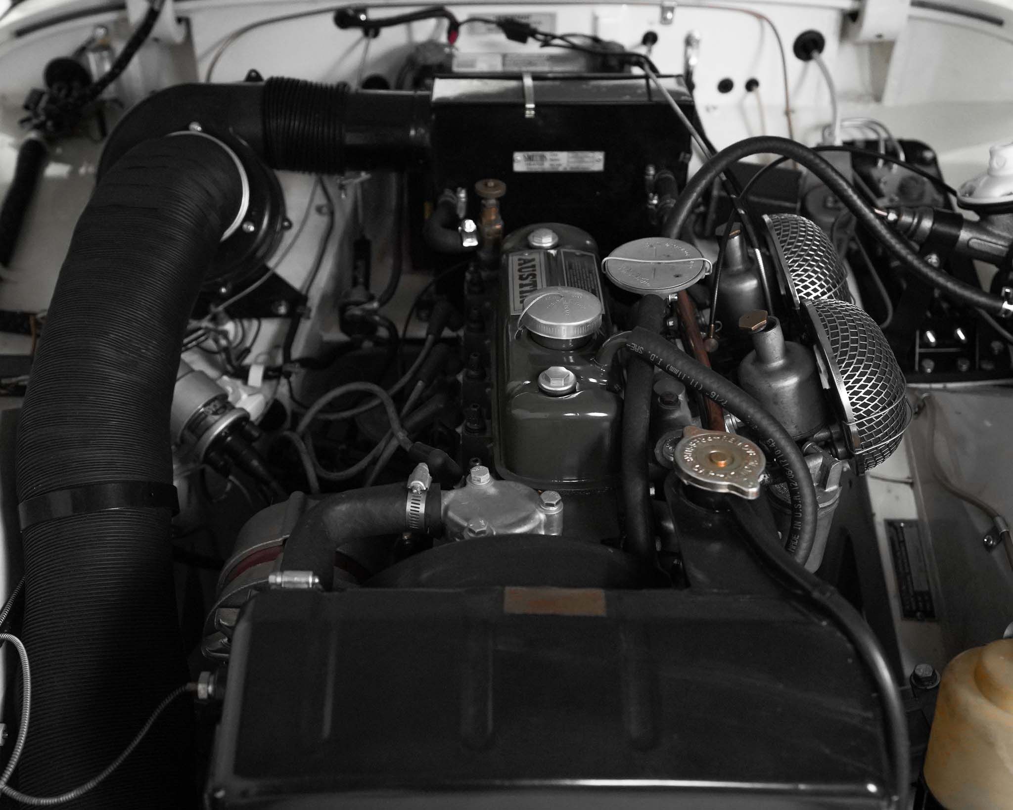The Austin Healey Sprite was designed by the Donald Healey Motor Company as an entry level sports car to suppliment the Austin Healey 100 series that Austin was already producing. The design of the Sprite, aside from the complete bonnet with its attached front wings, was a unitary bodied design, where the body was comprised of sheet metal and the stresses of the suspension and drivetrain were distributed through the body’s structure rather than relying on an underlying or integrated frame, like the larger Healey 100s. As the bonnet and front wings were separate it isn’t a true monocoque design. When originally designed, the Sprite was intended to have headlamps that hinged down flat into the bonnet when not in use, but to reduce costs they ended up fixed, giving it the characteristic appearance which disappeared on the succeeding generations of Sprites. In order to keep production costs down and minimize the expense of the new model, the car was designed to borrow heavily from other Austin products, primarily the Austin A35, which lent its front suspension, and most of the drivetrain to the Sprite. The steering, however, utilized the steering rack from a Morris Minor, giving the car precise, excellent steering. The rear axle, though the same as that on the Morris Minor and very similar to that on the A35, but utilizing different brakes, is located on quarter-eliptical springs, which provide springing but, along with a trailing arm, locate the axle under the car. Following the Mark 1 models, subsequent sprites were also badge engineered and sold as MG Midgets, but the MG Midget name was never applied to the first series. Originally fitted with a 948cc engine, 4 speed manual gearbox, and drum brakes all around, this example has been upgraded significantly by being fitted with the more powerful 1275cc engine and front disc brakes from the last A-Series engined Sprite. This has been coupled to a modified Datsun 5 speed gearbox, which, along with a change to a 3.9:1 final drive gives this Sprite a significant improvement in power and higher speed driving without any obvious changes to its appearance, either externally, or under the bonnet. The Sprites, whether in stock trim or as modified, like this example, really are excellent cars to drive with wonderful handling and decent performance given the limitations of its small size and displacement. Though a little car, once one is seated, they are a comfortable car to drive, even for taller drivers. Without roll up windows and with an occasional top that must be completely removed and folded away when not in use, as well as without a proper trunk, the Sprite really is not and was never really intended to be a daily driven car, but was intended and served very well as an occasional use and track day car which did more to introduce people to the hobby of racing than almost any other car of the era.