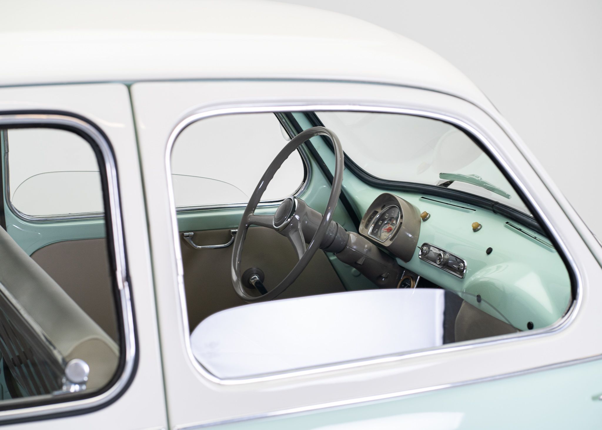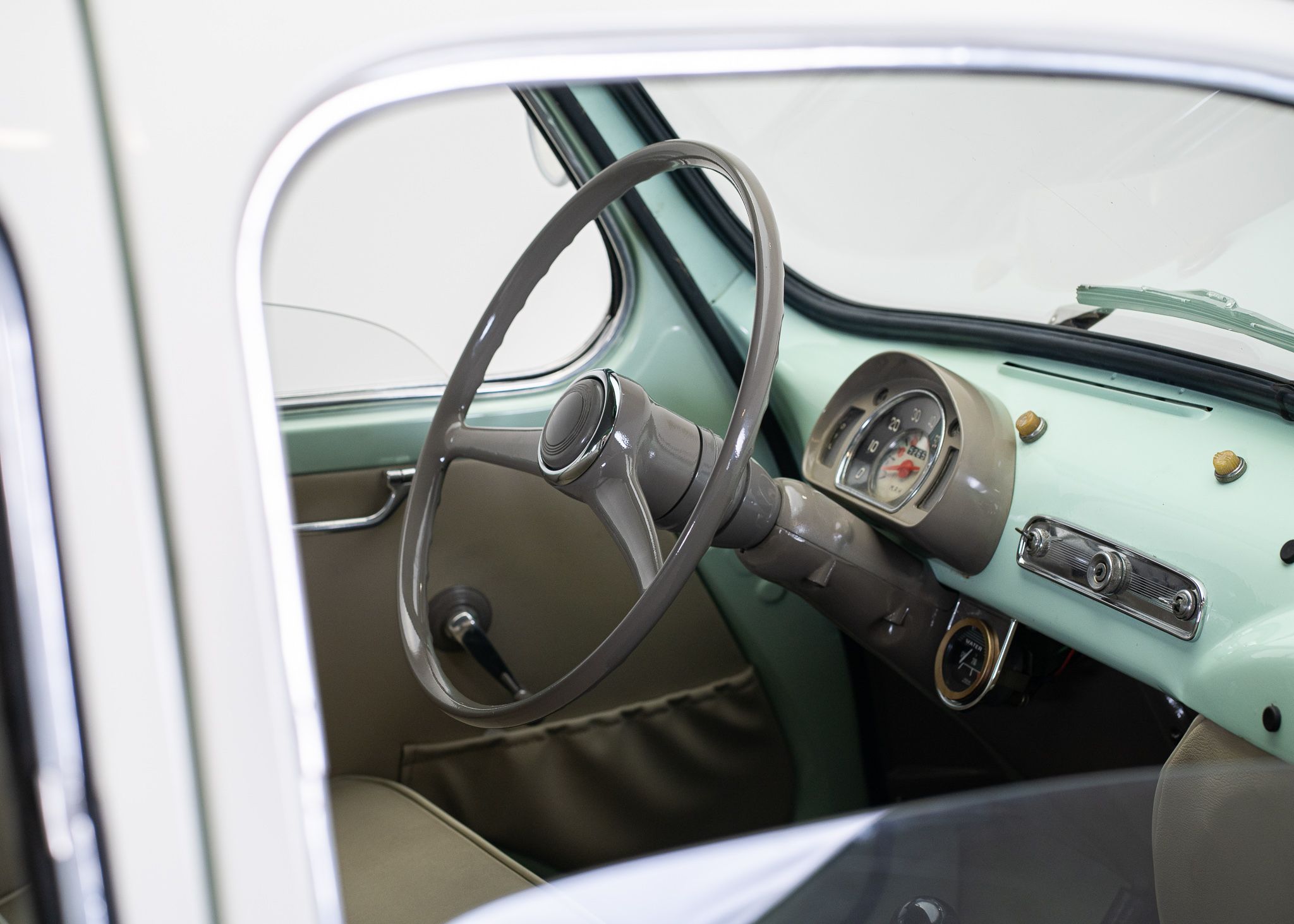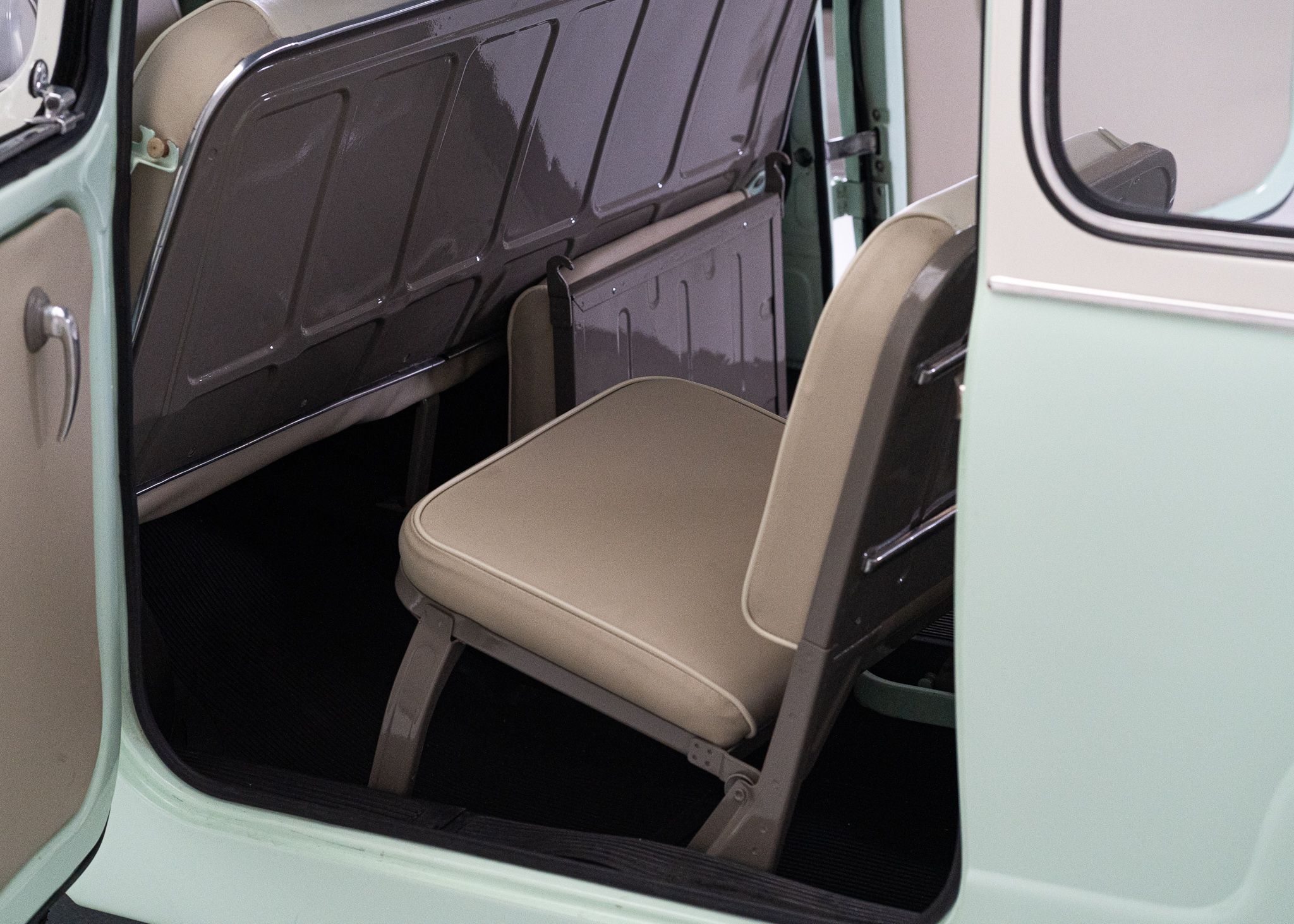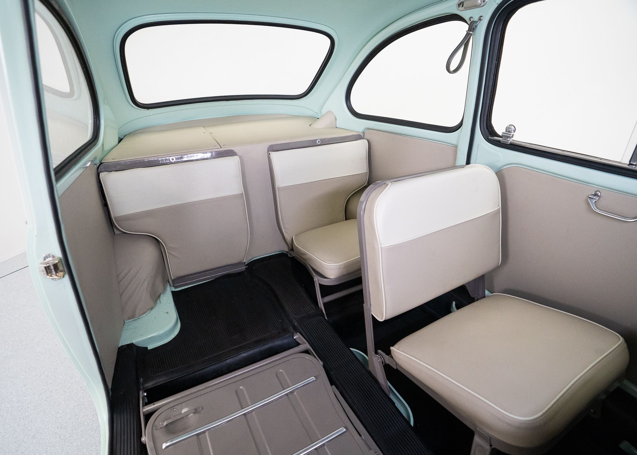 The Fiat 600 Multipla is a lightweight unibody people carrier, built on the same wheelbase and drivetrain as the far more common coupe, making for a remarkably compact, but very versatile vehicle. The front suspension is more closely related to the Fiat 1100, with the driver placed at the very front of the vehicle. The Multipla came in a three variations, with the major difference being the design of the seats, with one having bench seats in the back that, along with the front seat, can fold down into a bed, while the other, like this one, has rear seats that can be folded into the floor to form a flat loading area. The third configuration was specifically designed to serve as a taxi, and these were commonly used as taxis in Italy in the 1960s. The original engine fitted to the 600 Multipla was a 633cc 4 cylinder, producing only 21 bhp, so in order to allow the small engine to push the heavily loaded vehicle, a very tall final drive was fitted, yielding a top speed of 57 miles per hour, unladen. This example was an original North American market example, which can be identified by the 7 inch diameter headlights that replaced the much smaller European lamps. It was completely disassembled and restored by the previous owner in Vancouver BC, and fitted with a new old stock 903cc engine from a later Fiat that was mounted to the original gearbox, giving a significant upgrade to power. Driving the Multipla is a lot of fun as you spend most of your time pressing the gas pedal all the way to the floor to accelerate. It is certainly capable of keeping up in modern traffic in town, but without regearing, it would be dangerous to take it on a highway. It also takes a bit of getting used to the driving position, which has the driver sitting upright over the front axle, with the steering column disappearing into the floor between the driver’s feet, much like a VW bus, though in a significantly smaller vehicle.
