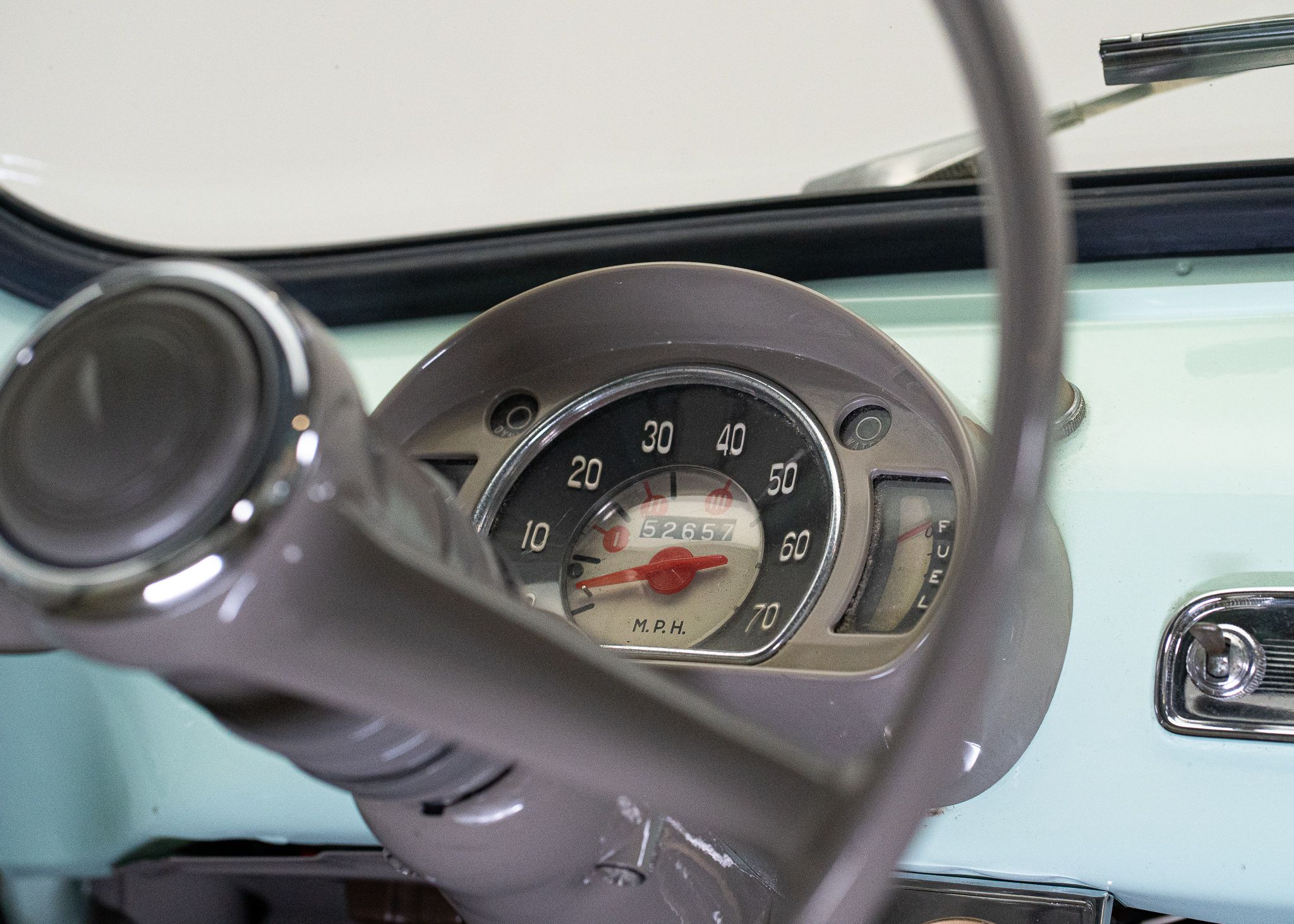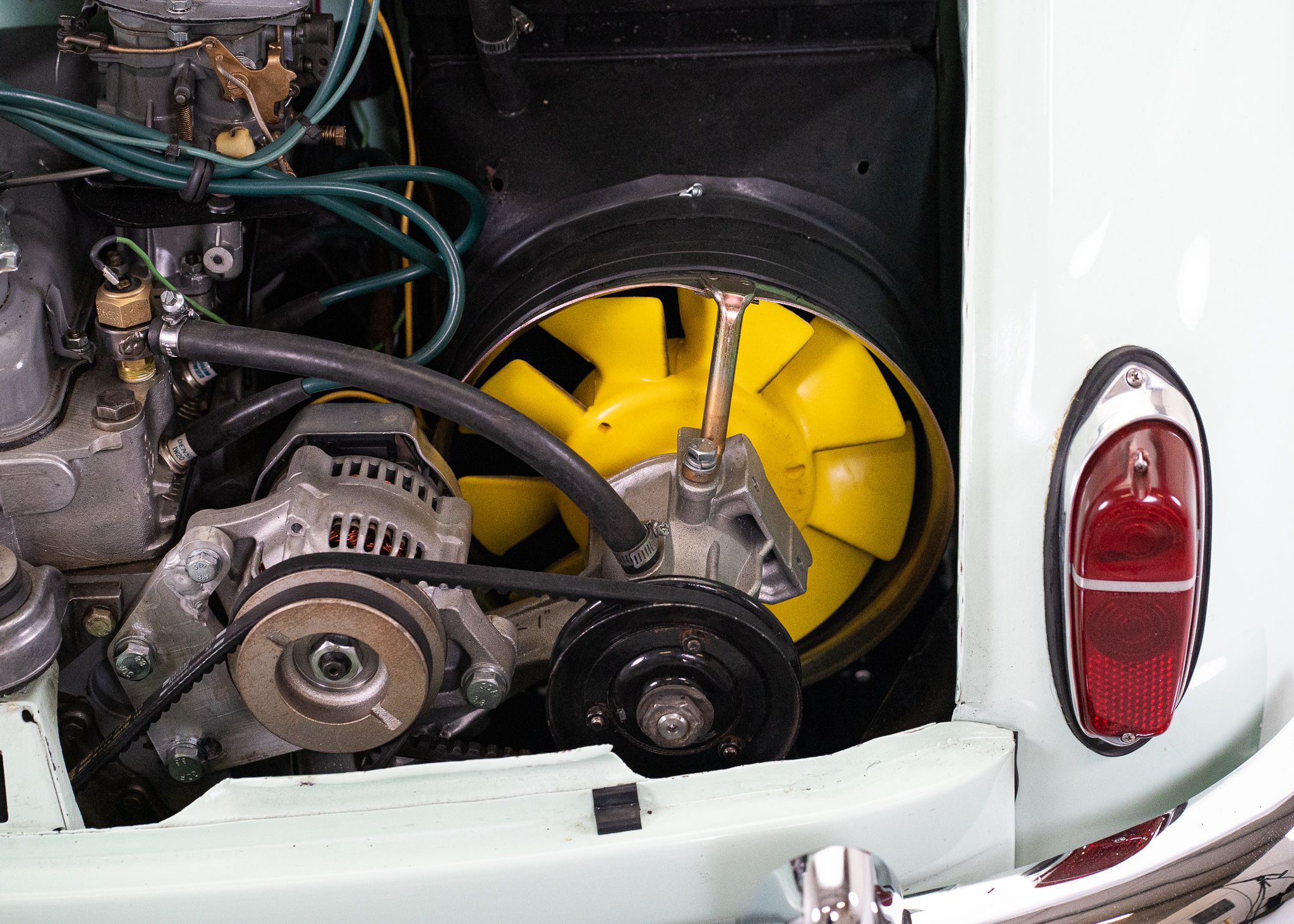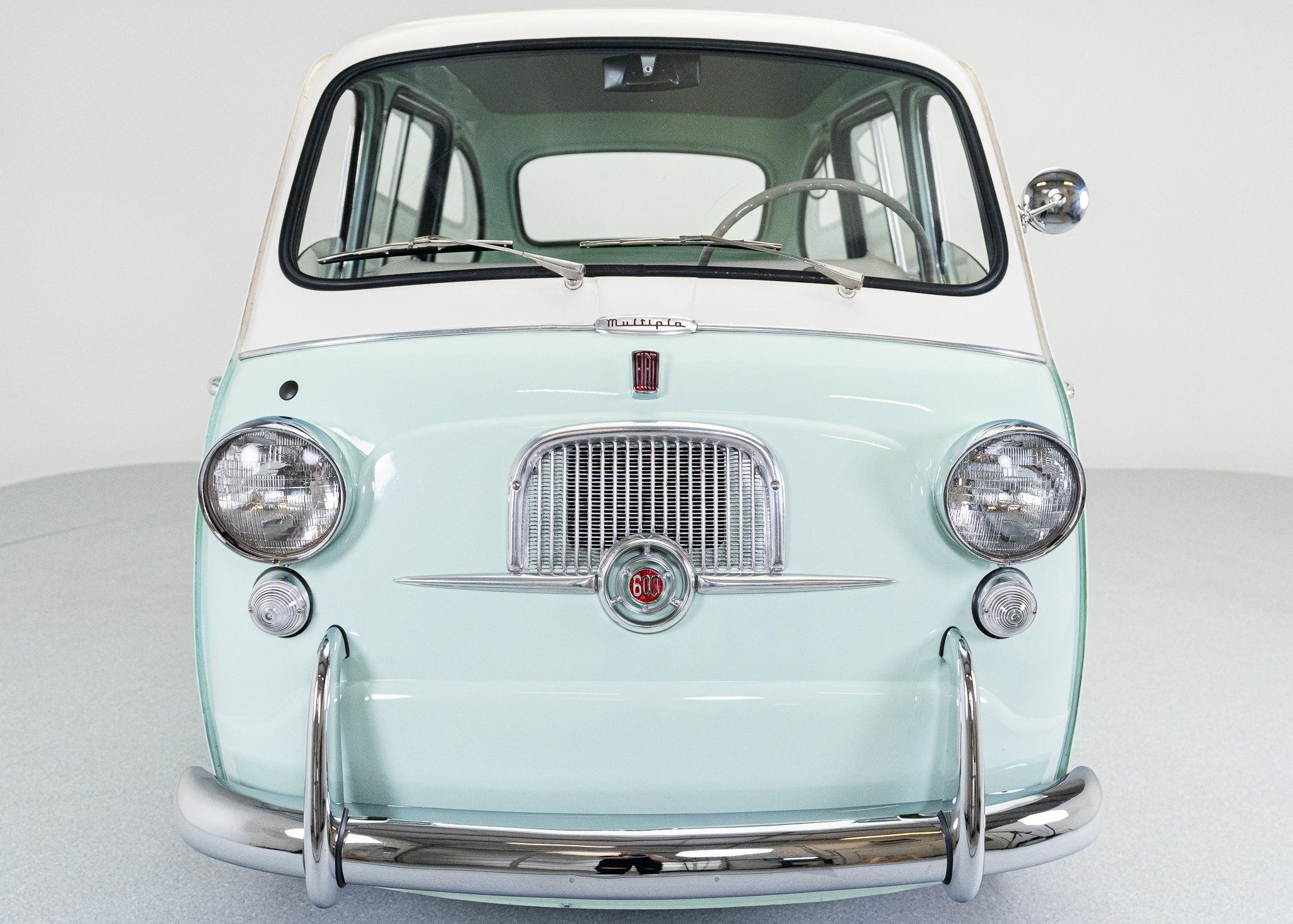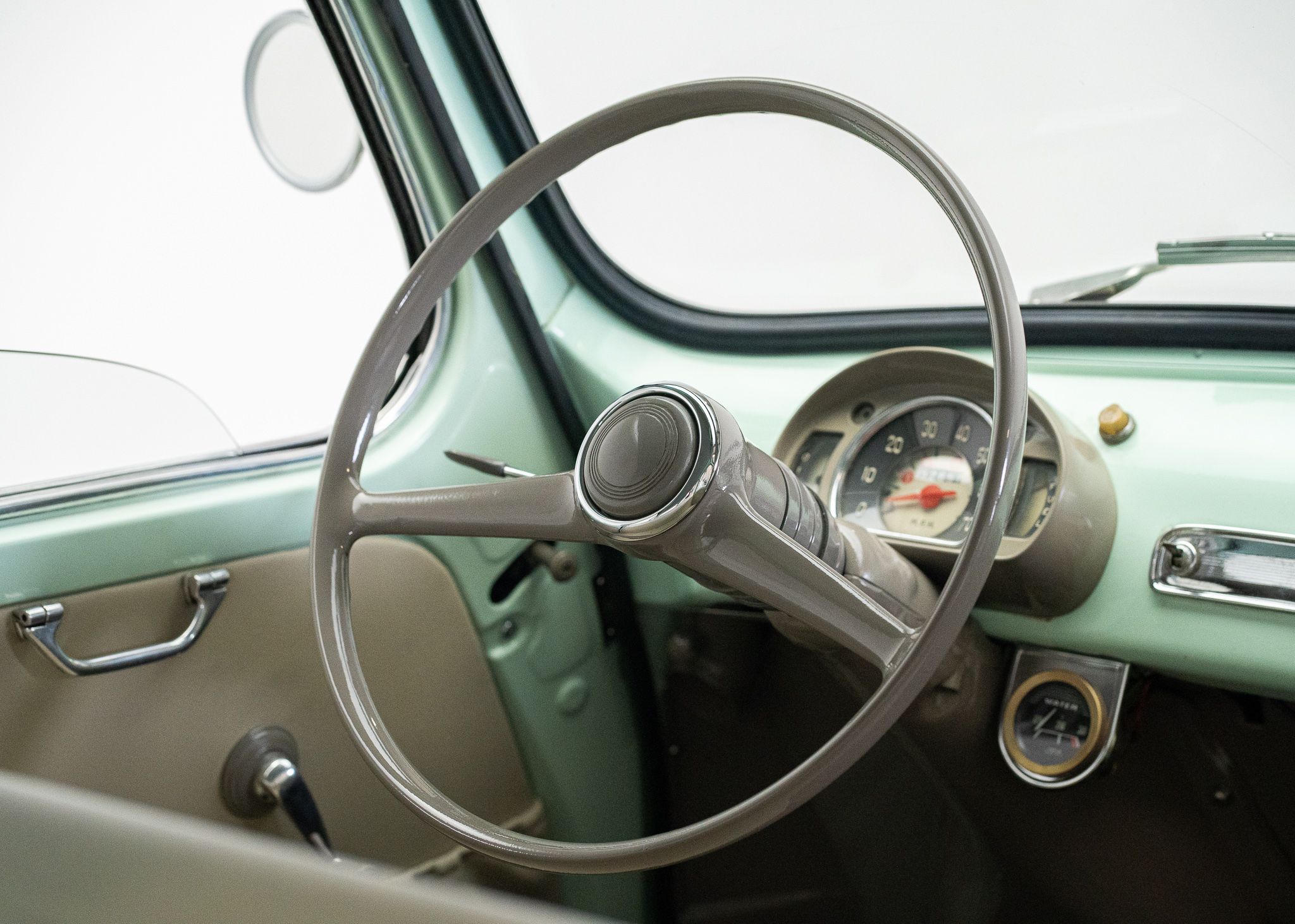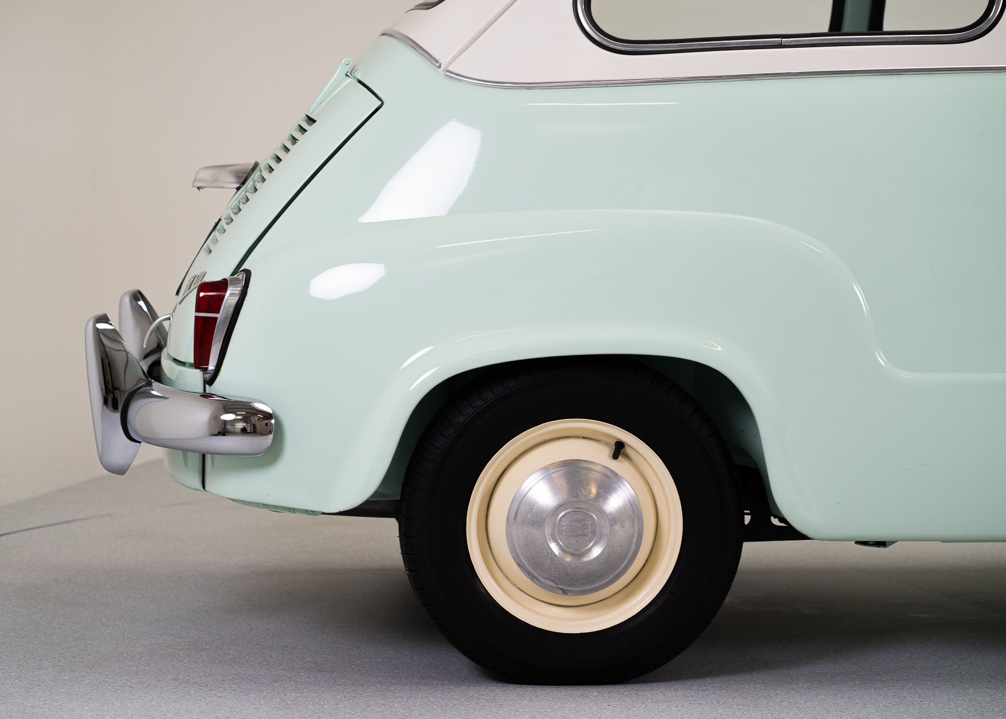 The Fiat 600 Multipla is a lightweight unibody people carrier, built on the same wheelbase and drivetrain as the far more common coupe, making for a remarkably compact, but very versatile vehicle. The front suspension is more closely related to the Fiat 1100, with the driver placed at the very front of the vehicle. The Multipla came in a three variations, with the major difference being the design of the seats, with one having bench seats in the back that, along with the front seat, can fold down into a bed, while the other, like this one, has rear seats that can be folded into the floor to form a flat loading area. The third configuration was specifically designed to serve as a taxi, and these were commonly used as taxis in Italy in the 1960s. The original engine fitted to the 600 Multipla was a 633cc 4 cylinder, producing only 21 bhp, so in order to allow the small engine to push the heavily loaded vehicle, a very tall final drive was fitted, yielding a top speed of 57 miles per hour, unladen. This example was an original North American market example, which can be identified by the 7 inch diameter headlights that replaced the much smaller European lamps. It was completely disassembled and restored by the previous owner in Vancouver BC, and fitted with a new old stock 903cc engine from a later Fiat that was mounted to the original gearbox, giving a significant upgrade to power. Driving the Multipla is a lot of fun as you spend most of your time pressing the gas pedal all the way to the floor to accelerate. It is certainly capable of keeping up in modern traffic in town, but without regearing, it would be dangerous to take it on a highway. It also takes a bit of getting used to the driving position, which has the driver sitting upright over the front axle, with the steering column disappearing into the floor between the driver’s feet, much like a VW bus, though in a significantly smaller vehicle.