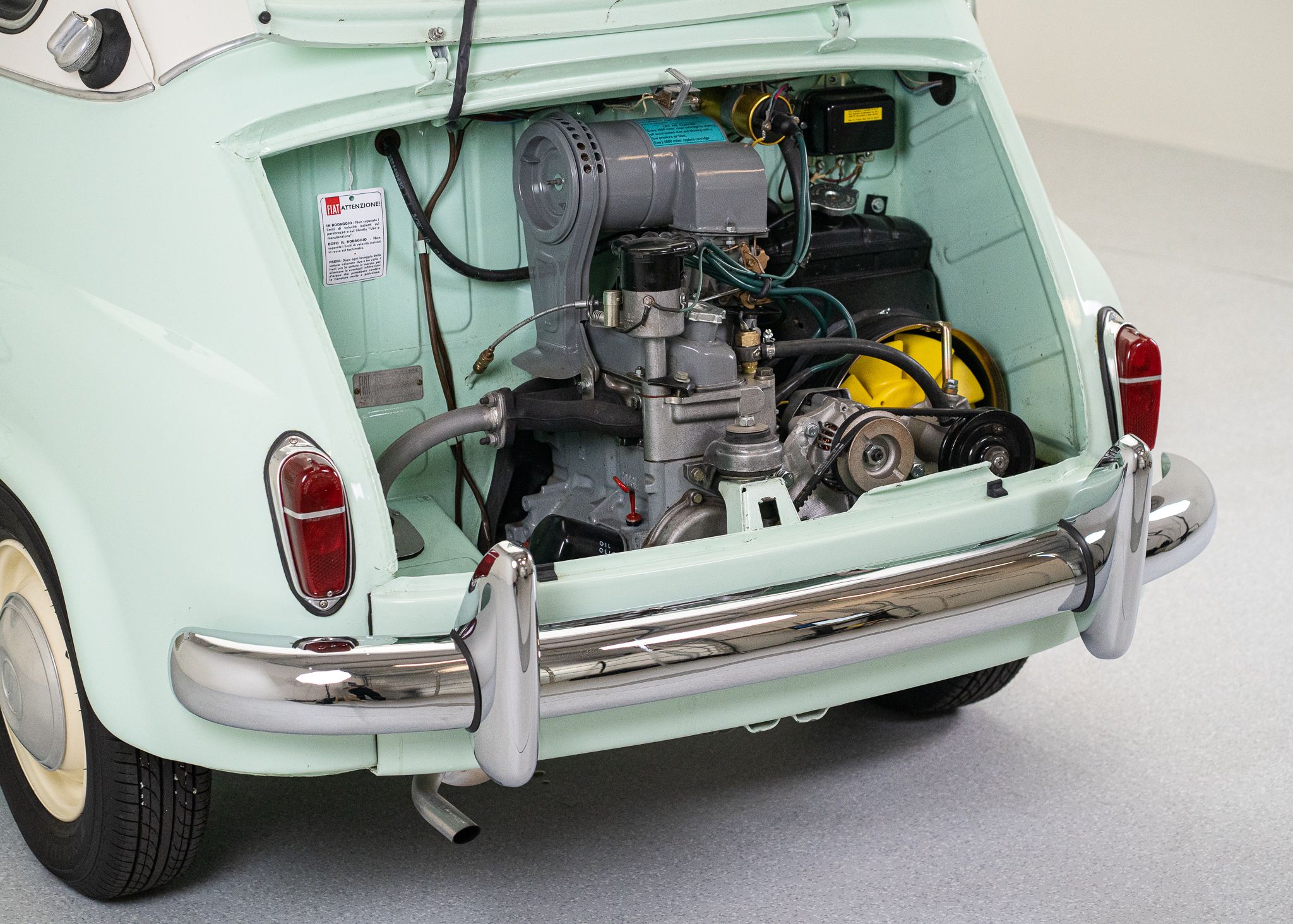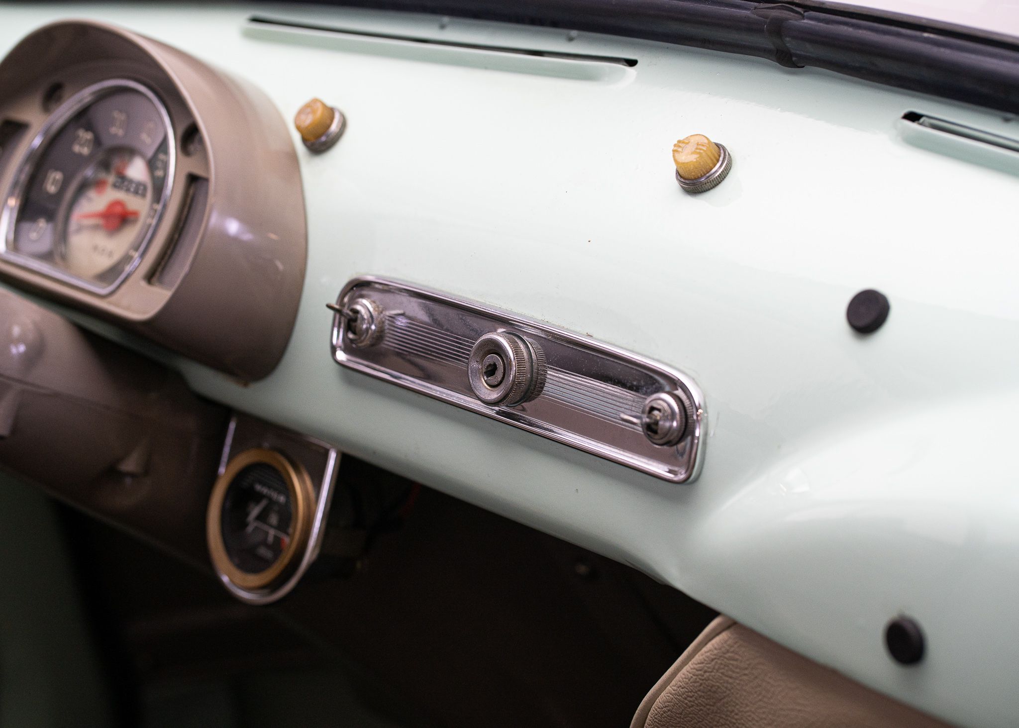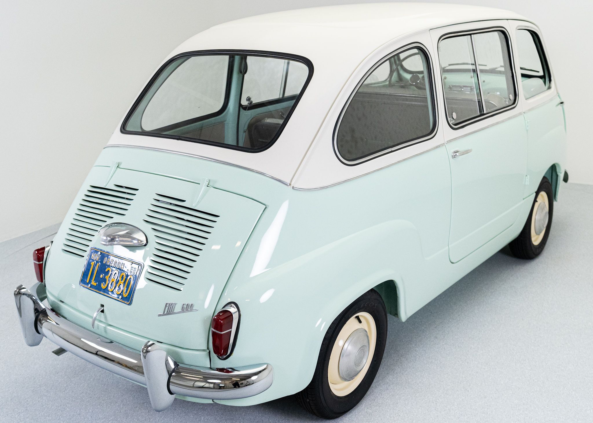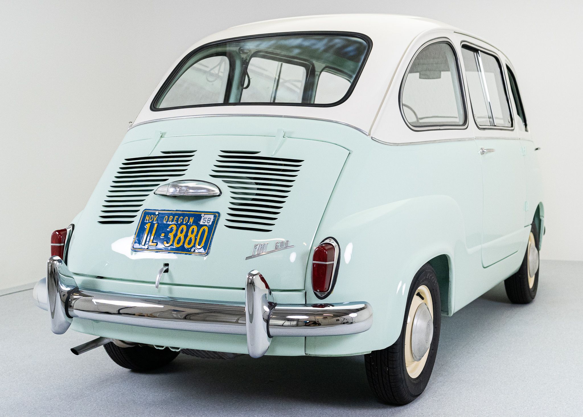 The Fiat 600 Multipla is a lightweight unibody people carrier, built on the same wheelbase and drivetrain as the far more common coupe, making for a remarkably compact, but very versatile vehicle. The front suspension is more closely related to the Fiat 1100, with the driver placed at the very front of the vehicle. The Multipla came in a three variations, with the major difference being the design of the seats, with one having bench seats in the back that, along with the front seat, can fold down into a bed, while the other, like this one, has rear seats that can be folded into the floor to form a flat loading area. The third configuration was specifically designed to serve as a taxi, and these were commonly used as taxis in Italy in the 1960s. The original engine fitted to the 600 Multipla was a 633cc 4 cylinder, producing only 21 bhp, so in order to allow the small engine to push the heavily loaded vehicle, a very tall final drive was fitted, yielding a top speed of 57 miles per hour, unladen. This example was an original North American market example, which can be identified by the 7 inch diameter headlights that replaced the much smaller European lamps. It was completely disassembled and restored by the previous owner in Vancouver BC, and fitted with a new old stock 903cc engine from a later Fiat that was mounted to the original gearbox, giving a significant upgrade to power. Driving the Multipla is a lot of fun as you spend most of your time pressing the gas pedal all the way to the floor to accelerate. It is certainly capable of keeping up in modern traffic in town, but without regearing, it would be dangerous to take it on a highway. It also takes a bit of getting used to the driving position, which has the driver sitting upright over the front axle, with the steering column disappearing into the floor between the driver’s feet, much like a VW bus, though in a significantly smaller vehicle.