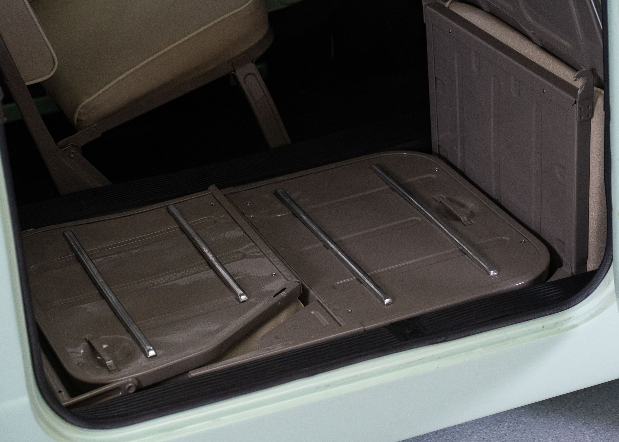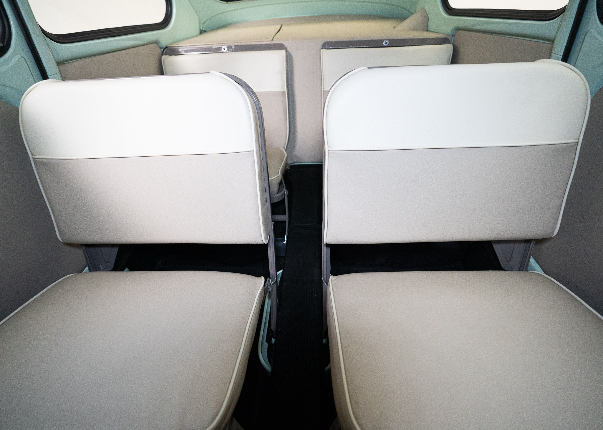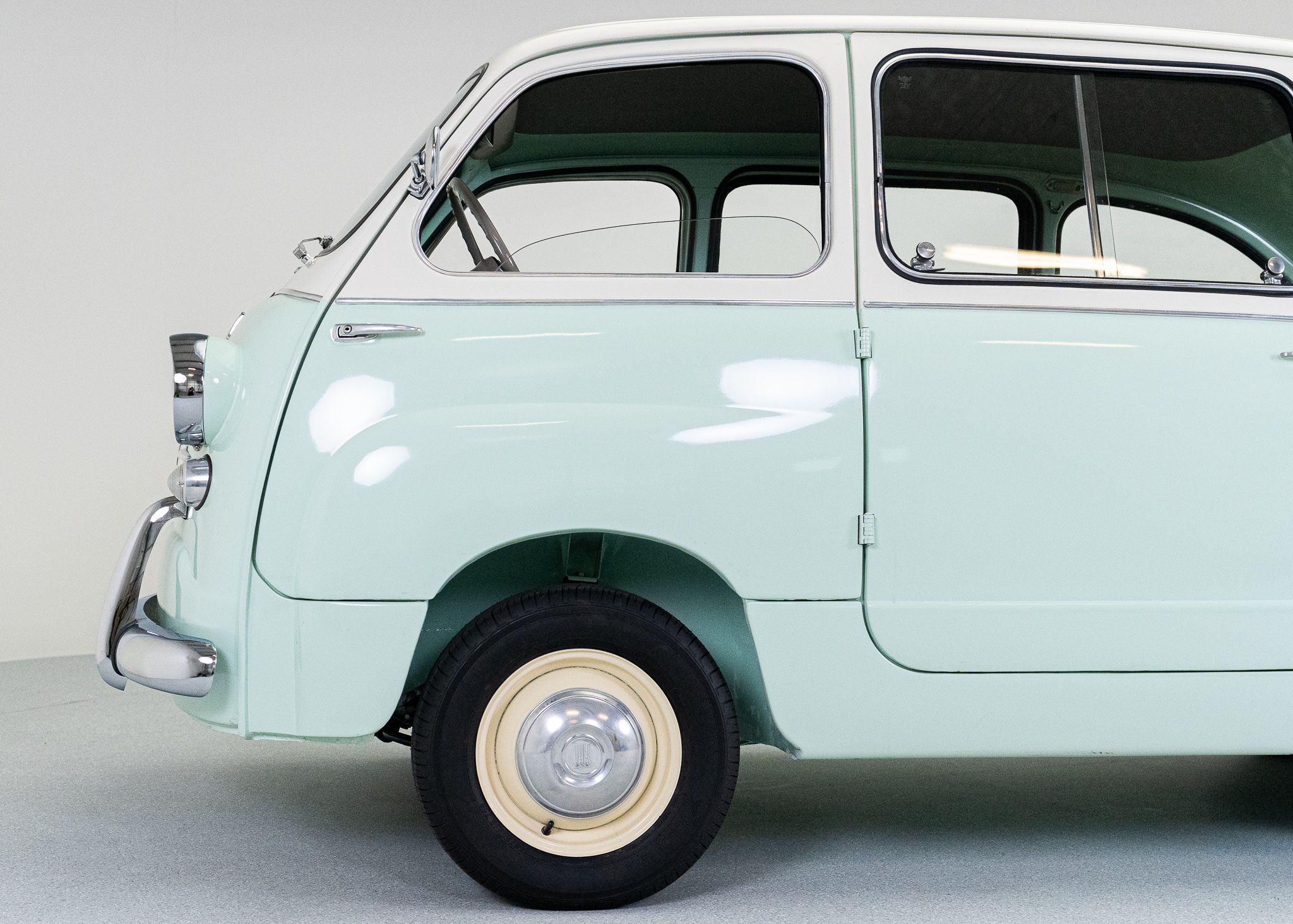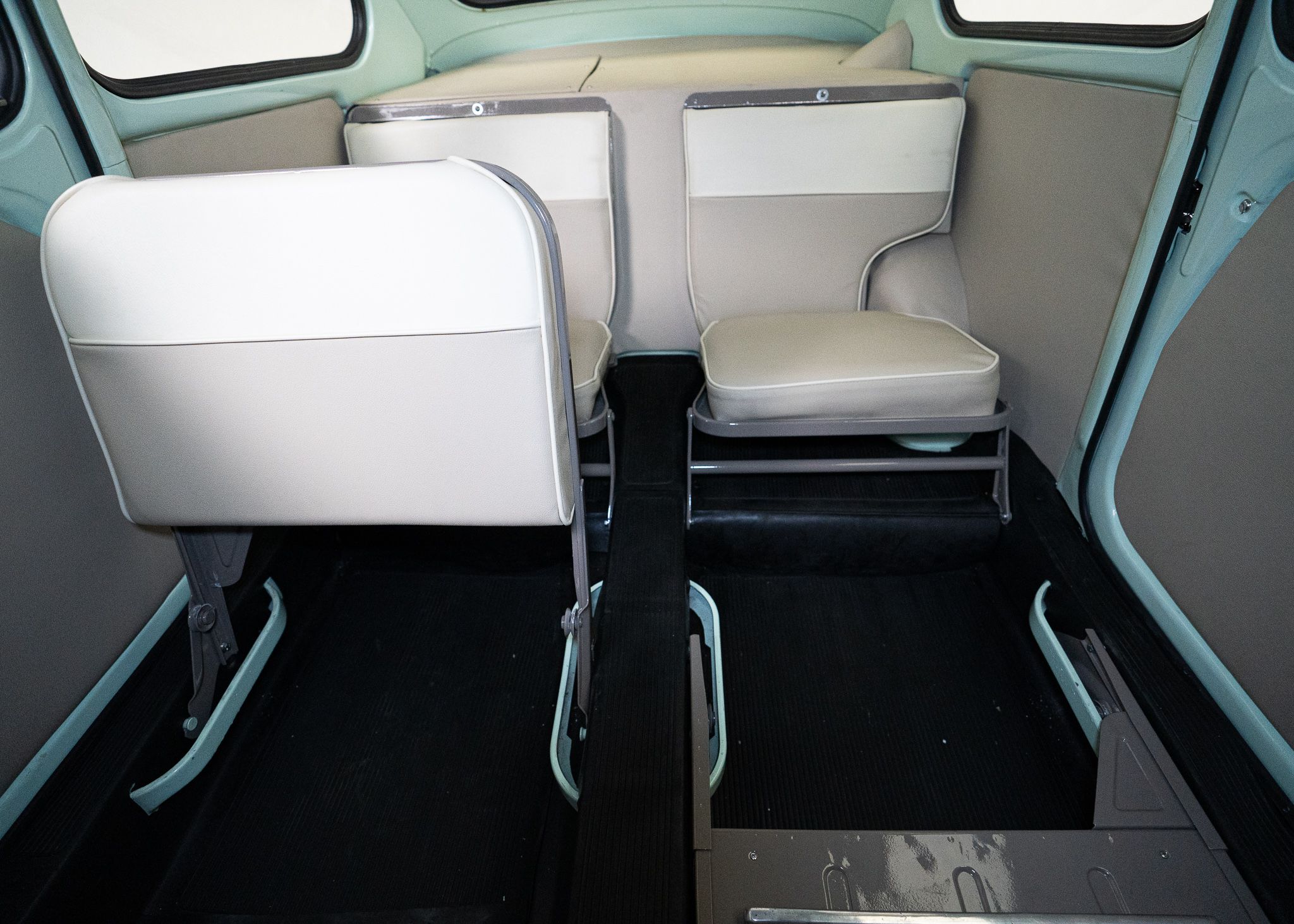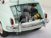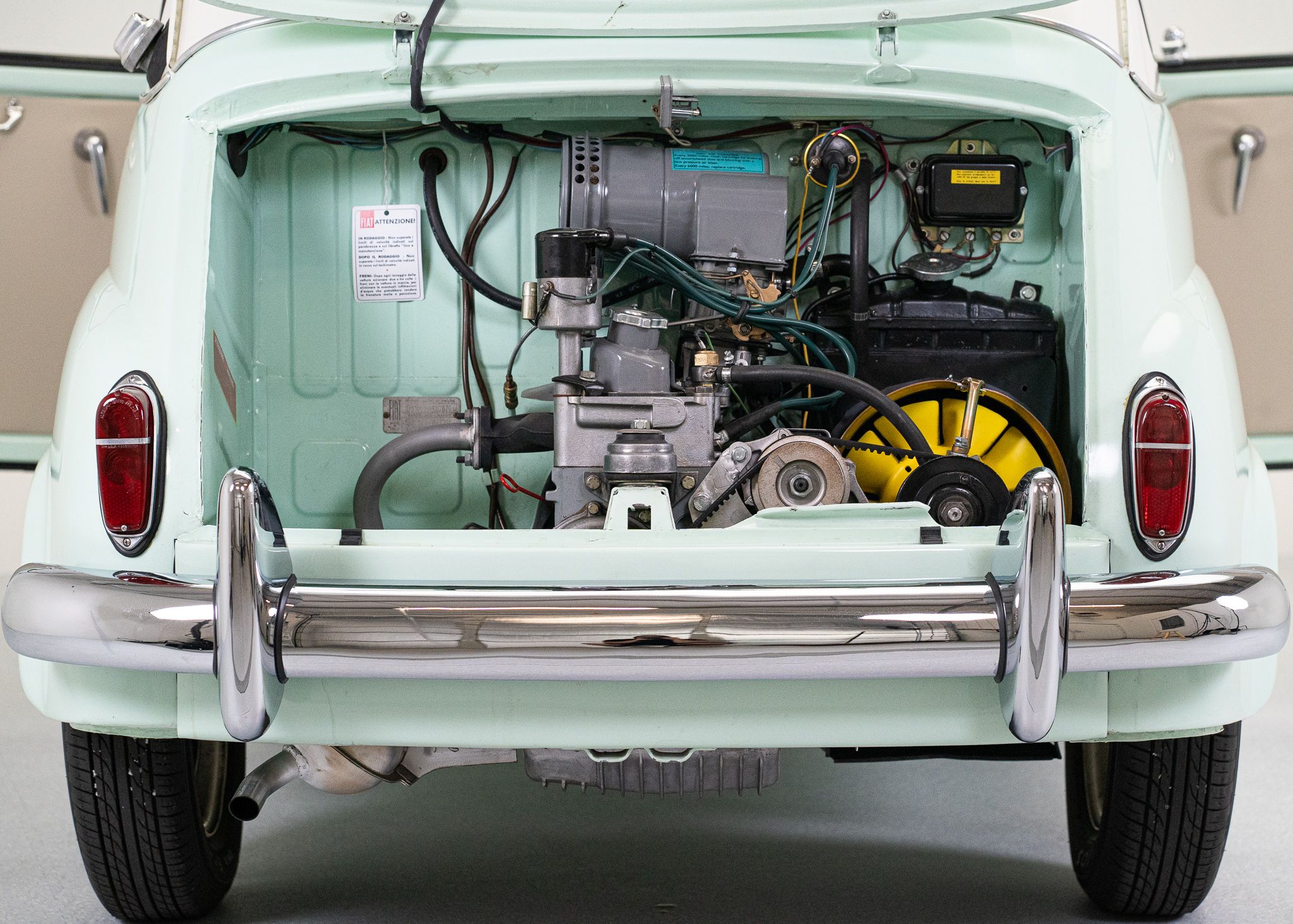 The Fiat 600 Multipla is a lightweight unibody people carrier, built on the same wheelbase and drivetrain as the far more common coupe, making for a remarkably compact, but very versatile vehicle. The front suspension is more closely related to the Fiat 1100, with the driver placed at the very front of the vehicle. The Multipla came in a three variations, with the major difference being the design of the seats, with one having bench seats in the back that, along with the front seat, can fold down into a bed, while the other, like this one, has rear seats that can be folded into the floor to form a flat loading area. The third configuration was specifically designed to serve as a taxi, and these were commonly used as taxis in Italy in the 1960s. The original engine fitted to the 600 Multipla was a 633cc 4 cylinder, producing only 21 bhp, so in order to allow the small engine to push the heavily loaded vehicle, a very tall final drive was fitted, yielding a top speed of 57 miles per hour, unladen. This example was an original North American market example, which can be identified by the 7 inch diameter headlights that replaced the much smaller European lamps. It was completely disassembled and restored by the previous owner in Vancouver BC, and fitted with a new old stock 903cc engine from a later Fiat that was mounted to the original gearbox, giving a significant upgrade to power. Driving the Multipla is a lot of fun as you spend most of your time pressing the gas pedal all the way to the floor to accelerate. It is certainly capable of keeping up in modern traffic in town, but without regearing, it would be dangerous to take it on a highway. It also takes a bit of getting used to the driving position, which has the driver sitting upright over the front axle, with the steering column disappearing into the floor between the driver’s feet, much like a VW bus, though in a significantly smaller vehicle.