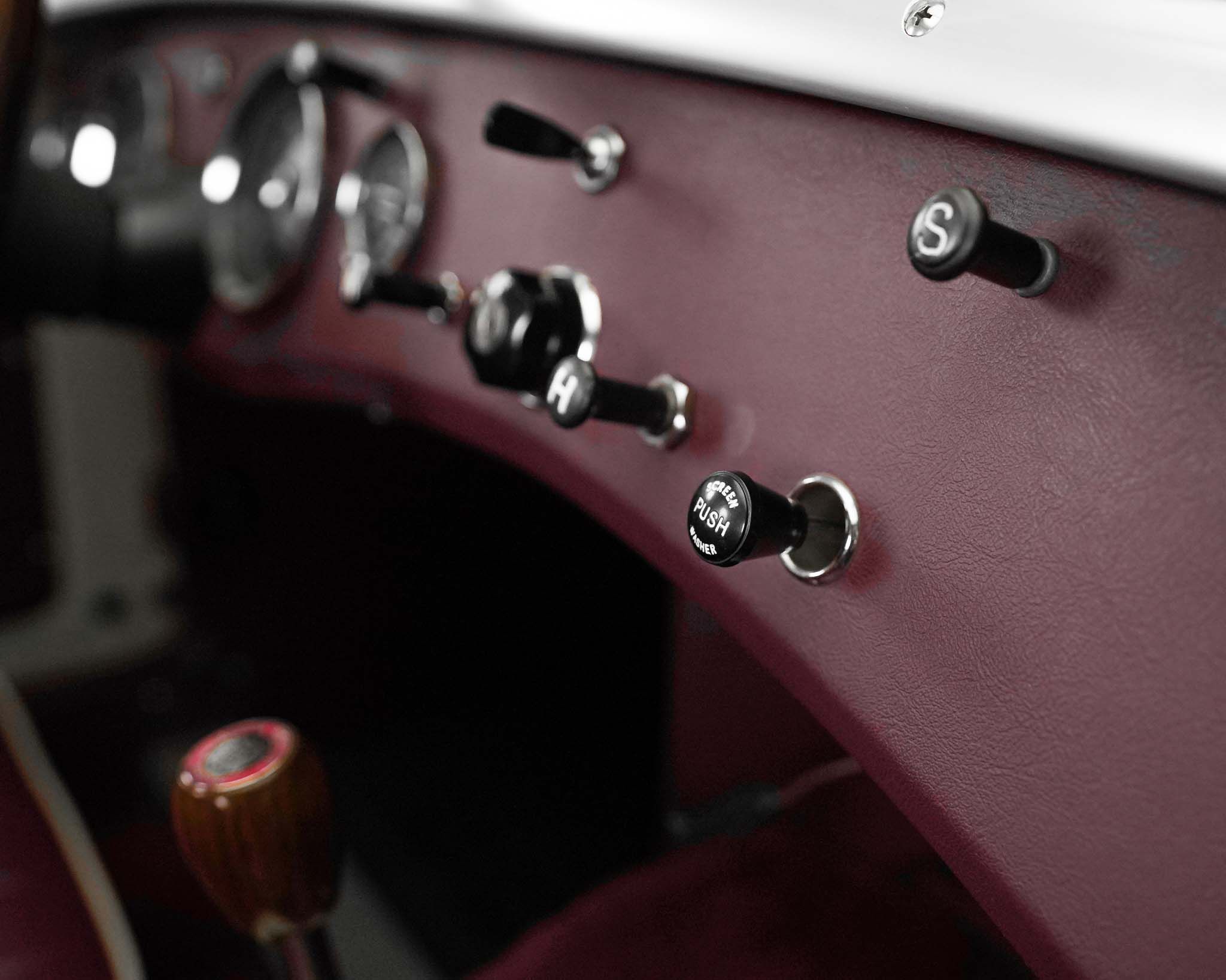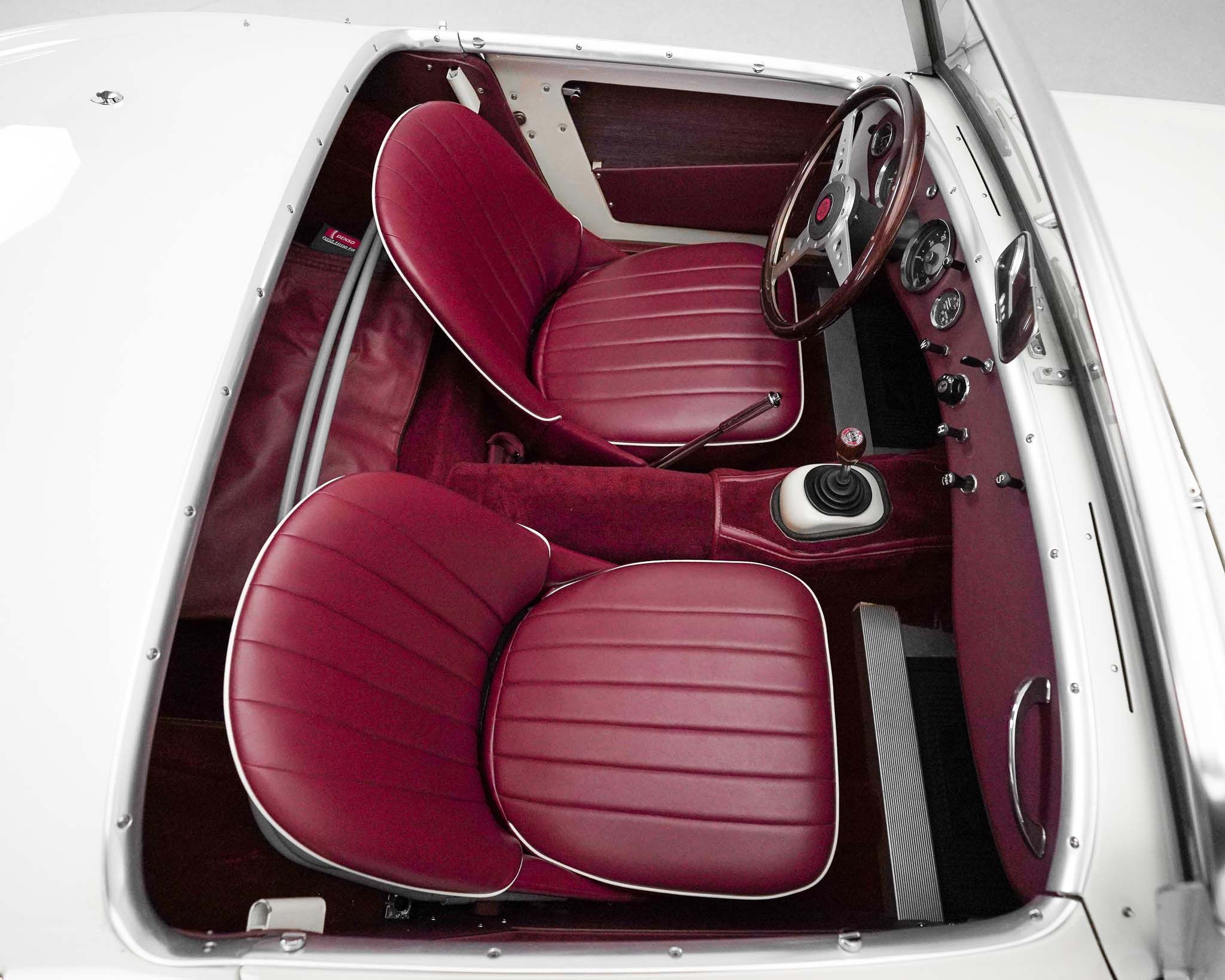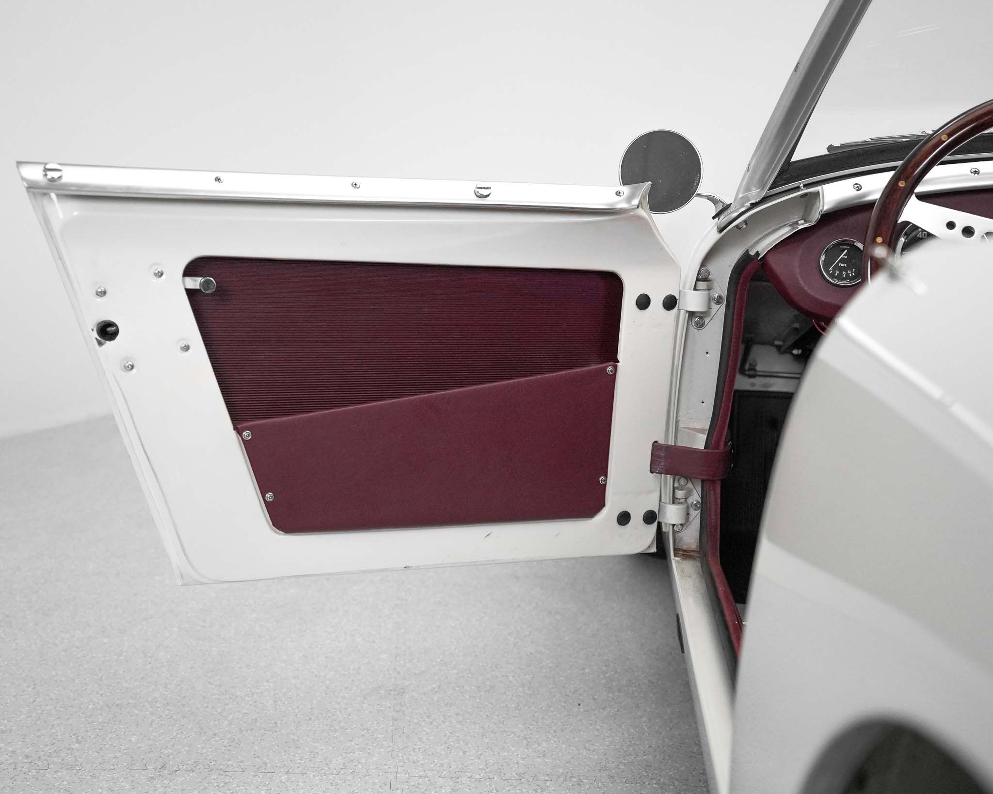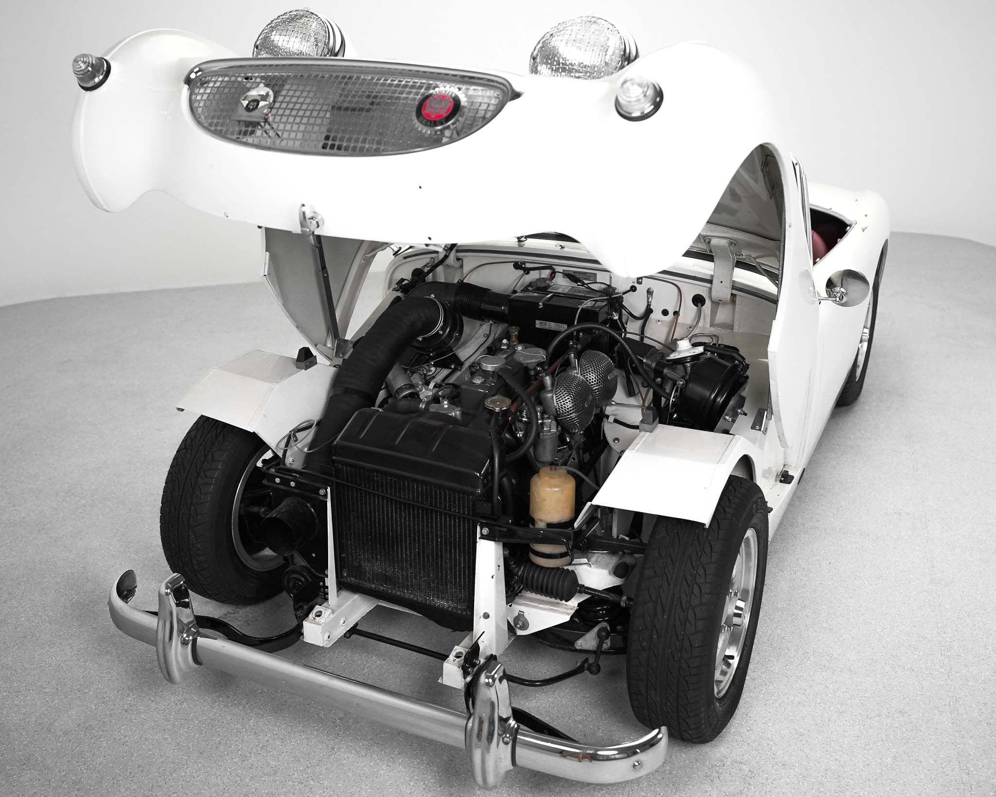 The Austin Healey Sprite was designed by the Donald Healey Motor Company as an entry level sports car to suppliment the Austin Healey 100 series that Austin was already producing. The design of the Sprite, aside from the complete bonnet with its attached front wings, was a unitary bodied design, where the body was comprised of sheet metal and the stresses of the suspension and drivetrain were distributed through the body’s structure rather than relying on an underlying or integrated frame, like the larger Healey 100s. As the bonnet and front wings were separate it isn’t a true monocoque design. When originally designed, the Sprite was intended to have headlamps that hinged down flat into the bonnet when not in use, but to reduce costs they ended up fixed, giving it the characteristic appearance which disappeared on the succeeding generations of Sprites. In order to keep production costs down and minimize the expense of the new model, the car was designed to borrow heavily from other Austin products, primarily the Austin A35, which lent its front suspension, and most of the drivetrain to the Sprite. The steering, however, utilized the steering rack from a Morris Minor, giving the car precise, excellent steering. The rear axle, though the same as that on the Morris Minor and very similar to that on the A35, but utilizing different brakes, is located on quarter-eliptical springs, which provide springing but, along with a trailing arm, locate the axle under the car. Following the Mark 1 models, subsequent sprites were also badge engineered and sold as MG Midgets, but the MG Midget name was never applied to the first series. Originally fitted with a 948cc engine, 4 speed manual gearbox, and drum brakes all around, this example has been upgraded significantly by being fitted with the more powerful 1275cc engine and front disc brakes from the last A-Series engined Sprite. This has been coupled to a modified Datsun 5 speed gearbox, which, along with a change to a 3.9:1 final drive gives this Sprite a significant improvement in power and higher speed driving without any obvious changes to its appearance, either externally, or under the bonnet. The Sprites, whether in stock trim or as modified, like this example, really are excellent cars to drive with wonderful handling and decent performance given the limitations of its small size and displacement. Though a little car, once one is seated, they are a comfortable car to drive, even for taller drivers. Without roll up windows and with an occasional top that must be completely removed and folded away when not in use, as well as without a proper trunk, the Sprite really is not and was never really intended to be a daily driven car, but was intended and served very well as an occasional use and track day car which did more to introduce people to the hobby of racing than almost any other car of the era.